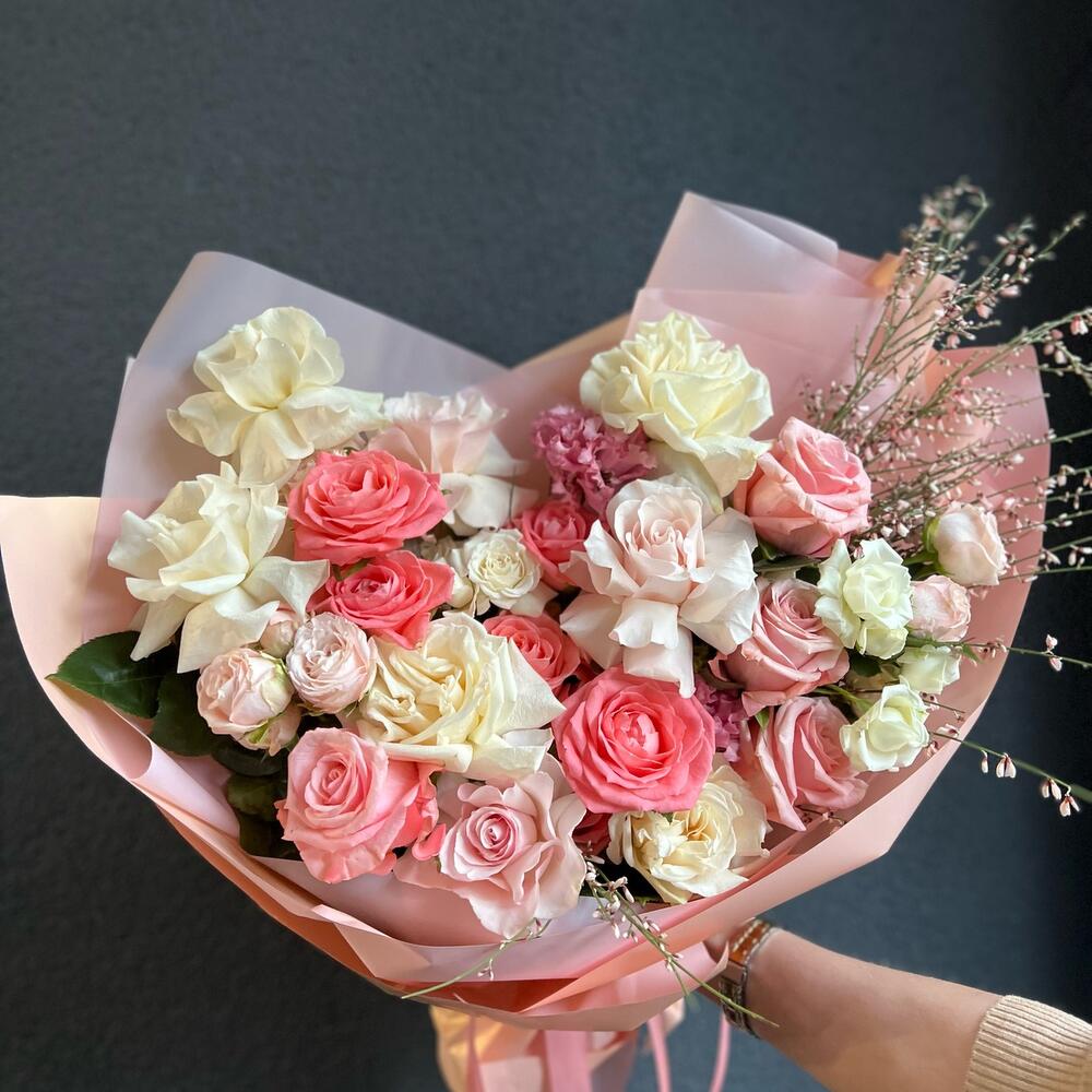 Одноголовая роза – 12 шт.Кустовая роза – 7 шт.эустома (лизиантус) – 3 шт.Гениста – 2 шт.декоративная упаковка – 1 шт.Атласная лента – 1 шт.