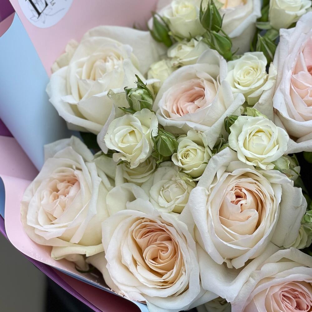 Роза кустовая – 4 шт.Упаковка дизайнерская – 4 шт.лента фирменная – 2 шт.Фоамиран (упаковка) – 1 шт.white o’hara пионовидная роза – 9 шт.