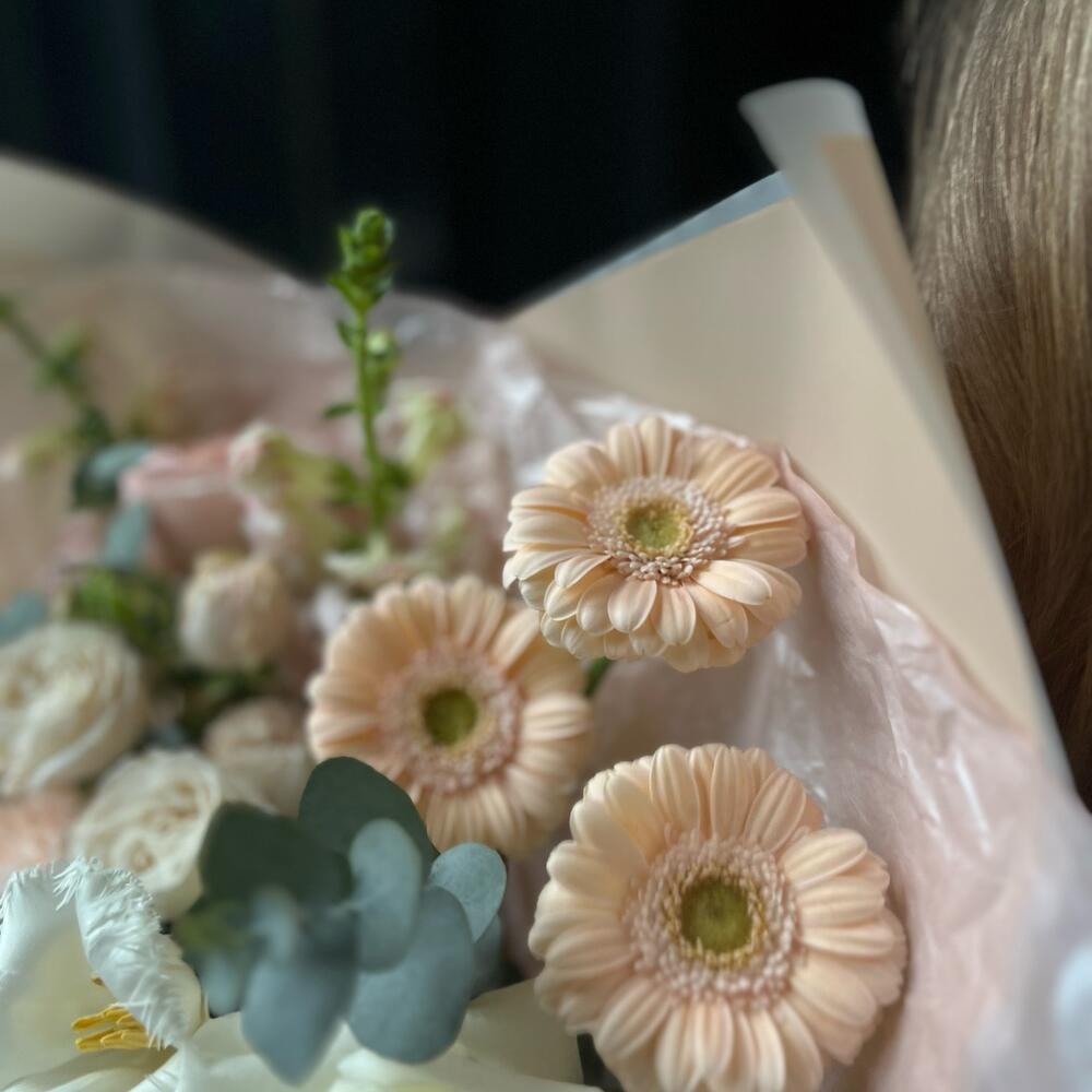 Пионовидная роза – 5 шт.Кустовая роза – 1 шт.Гербера – 3 шт.Диантус – 3 шт.Ранункулюс – 1 шт.Эустома – 1 шт.антиринум – 2 шт.тюльпаны – 2 шт.Эвкалипт – 1 шт.декоративная упаковка – 1 шт.Атласная лента – 1 шт.