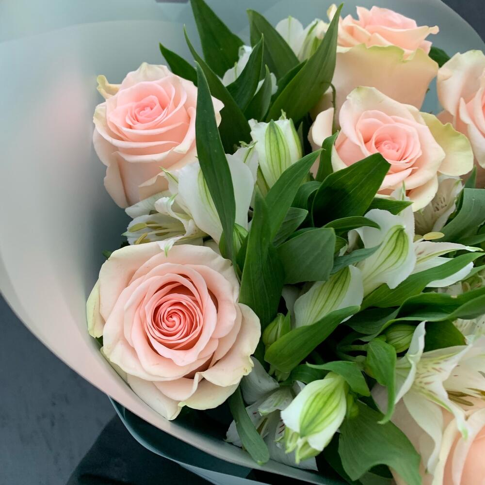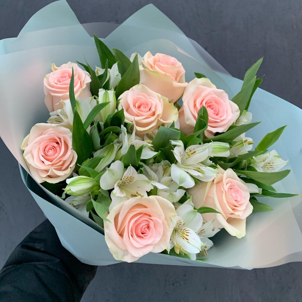 Роза – 7 шт.Альстромерия – 8 шт.Упаковка дизайнерская – 1 шт.
