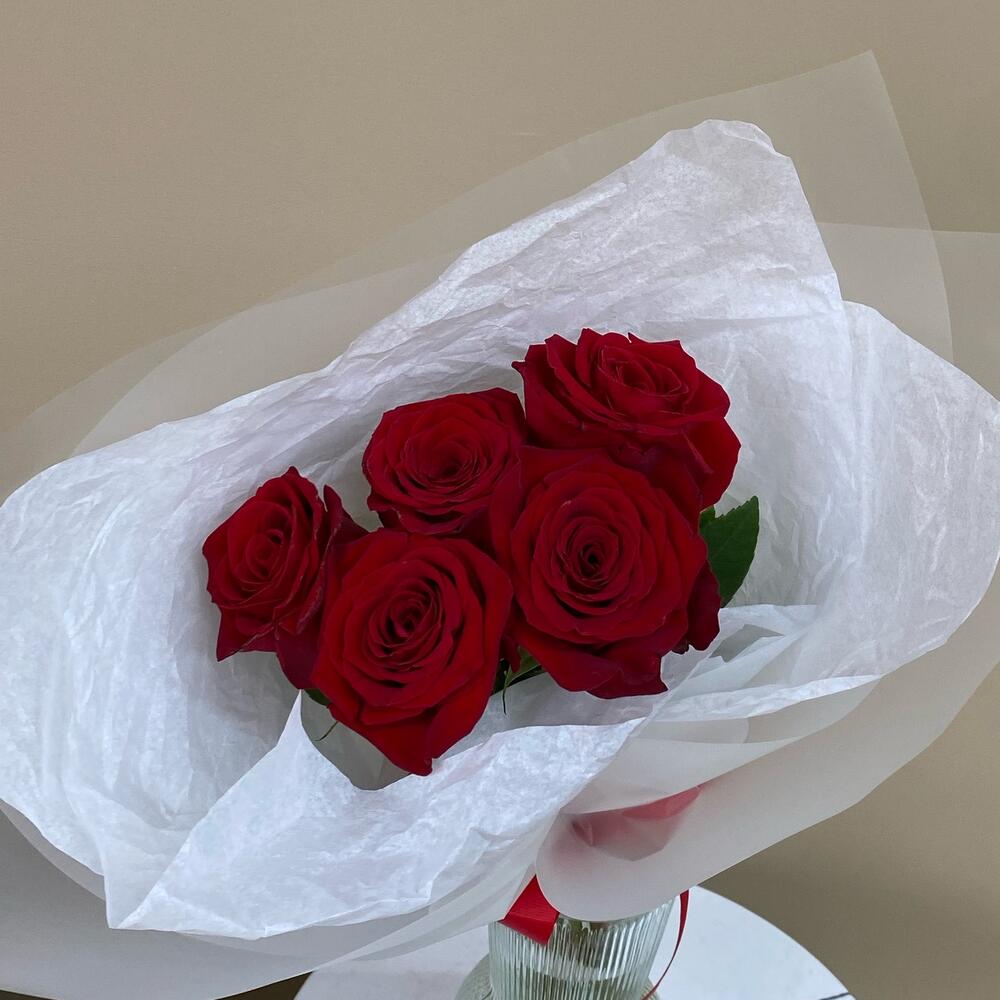 красные розы – 5 шт.Фирменная упаковка – 1 шт.
