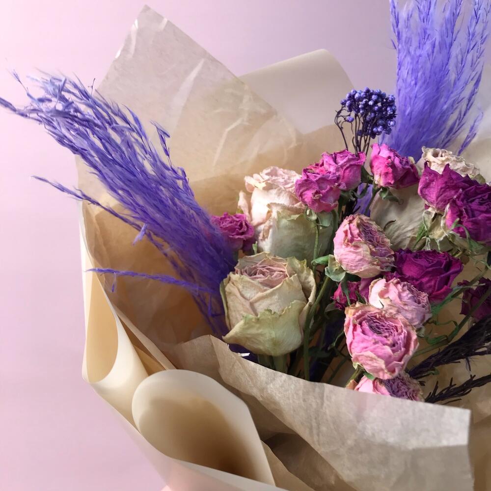 Ковыль – 2 шт.озотамнус стабилизированный – 2 шт.роза кустовая засушенная – 2 шт.роза засушенная – 3 шт.Оформление – 1 шт.