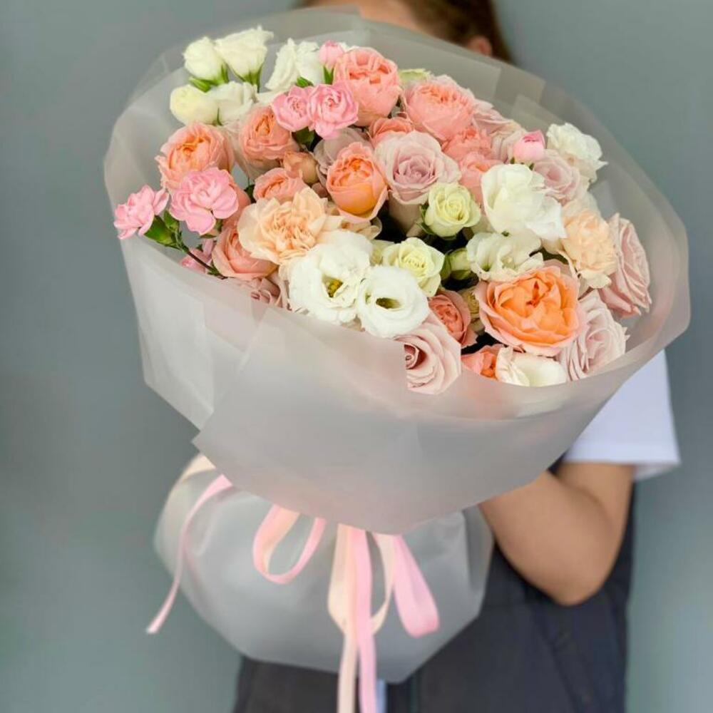 Гвоздики, Кустовые розы, Лизиантусы, Пионовидные розы, Розы