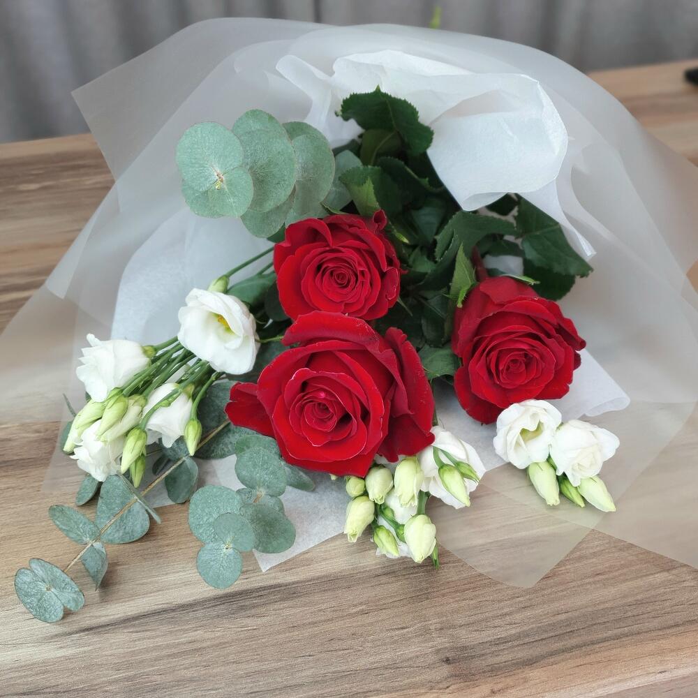 Эвкалипт – 2 шт.Роза – 3 шт.Эустома – 2 шт.Упаковка дизайнерская – 2 шт.