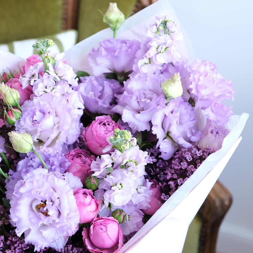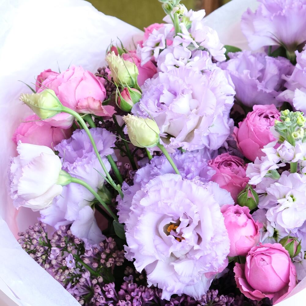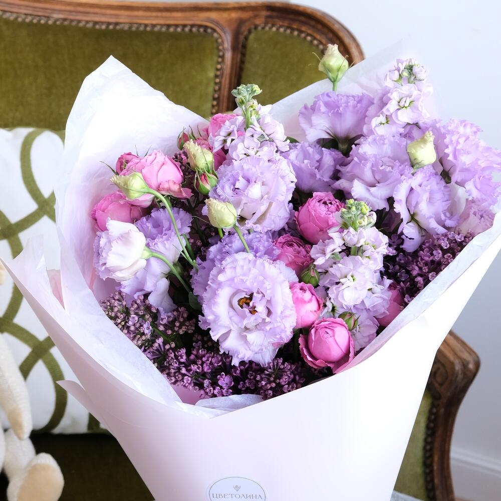 Роза бомбастик кустовая – 3 шт.Лизиантус сиреневый – 3 шт.маттиола сиреневая ароматная – 3 шт.Сирень сиреневая – 4 шт.Упаковка дизайнерская – 2 шт.