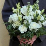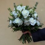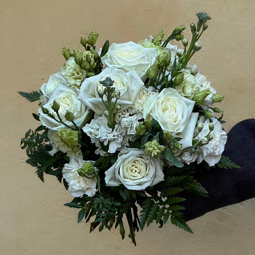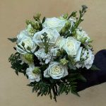 Лизиантус – 3 шт.Маттиола – 3 шт.Папоротник – 2 шт.Гвоздика – 8 шт.Фисташка – 4 шт.роза плая бланка – 7 шт.