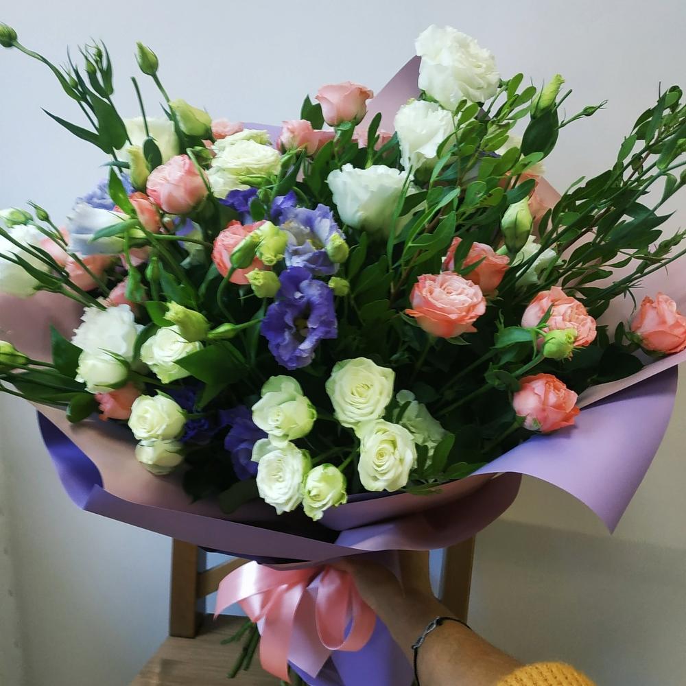Кустовая роза – 7 шт. эустома белая – 5 шт. эустома синяя – 5 шт. Фисташка – 5 шт. Упаковка дизайнерская – 5 шт. Лента атласная – 1 шт. Пакет подарочный – 1 шт.
