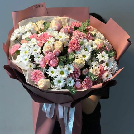 Эустома – 1 шт. Кустовая роза – 4 шт. Гвоздика – 2 шт. Роза – 6 шт. Хризантема кустовая – 2 шт. Упаковка – 1 шт.