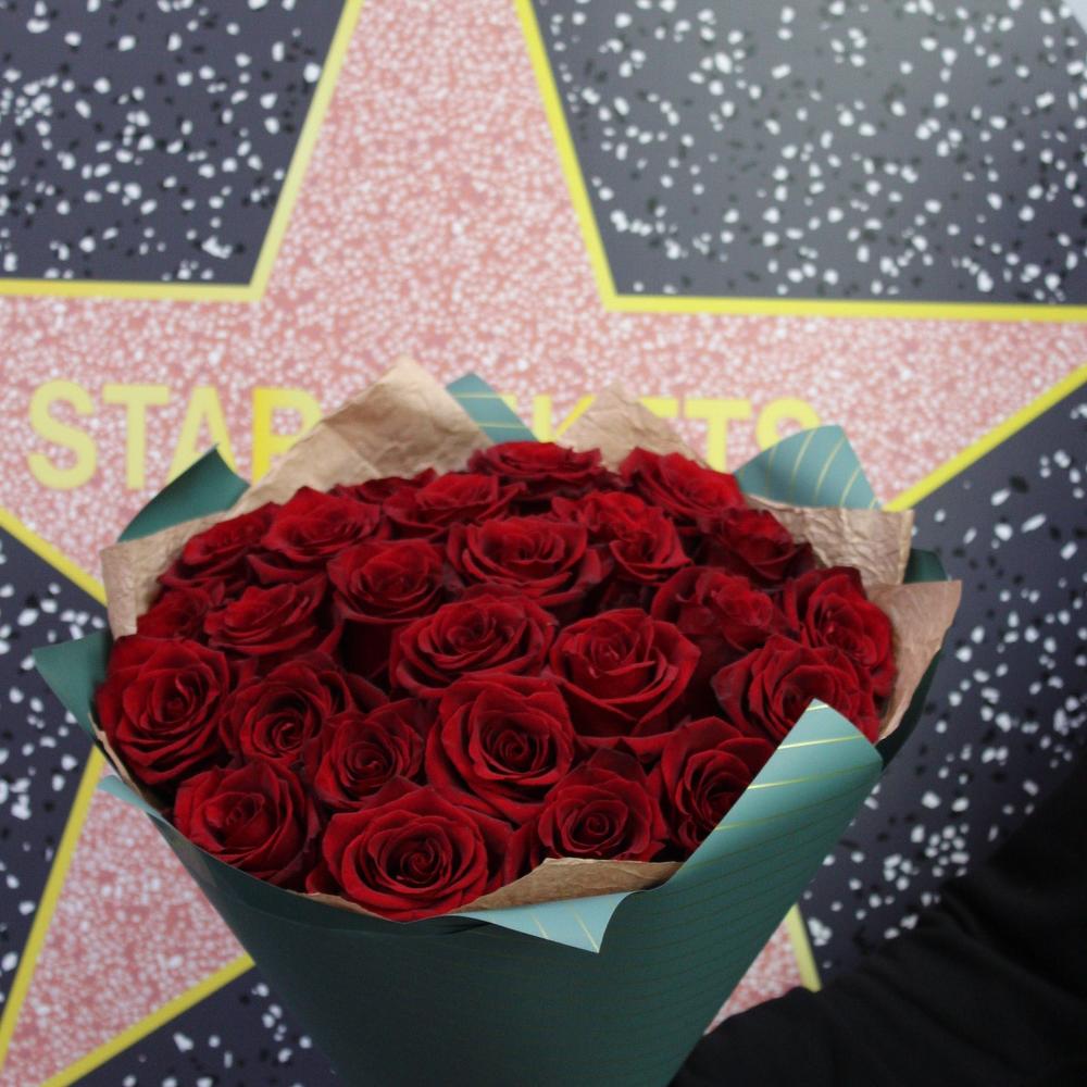 Лента атласная – 2 шт.Роза Эксплорер – 25 шт.Пленка матовая – 2 шт.Крафт жатый – 2 шт.