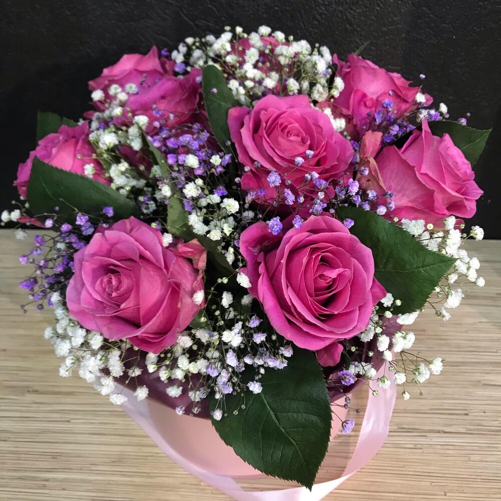 Роза 50 см – 9 шт.Гипсофила – 2 шт.Тишью – 1 шт.Коробка шляпная – 1 шт.