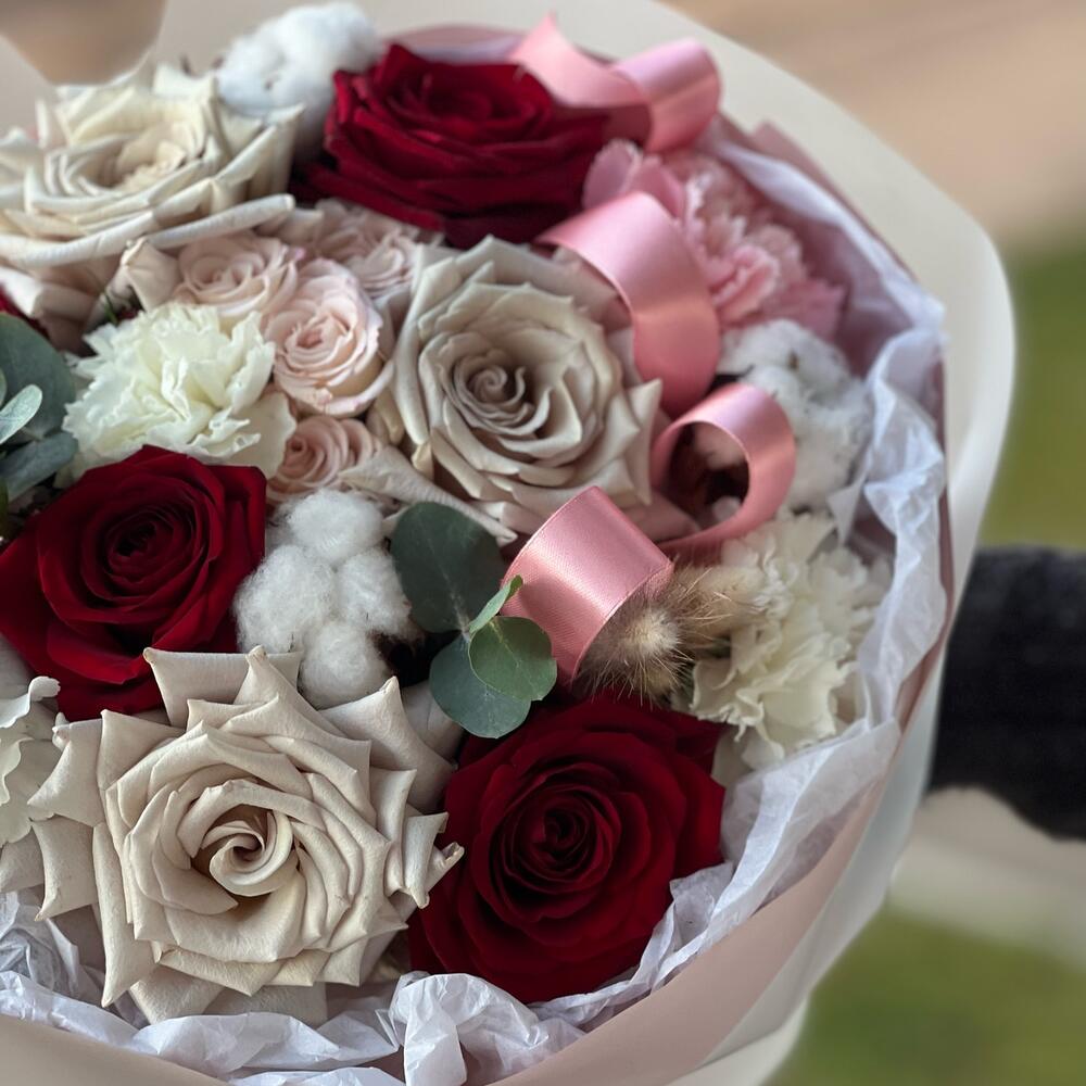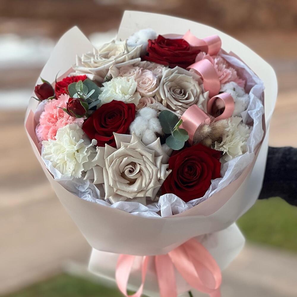 Категорий: Гвоздики, Кустовые розы, Пионовидные розы, Розы, Сухоцвет