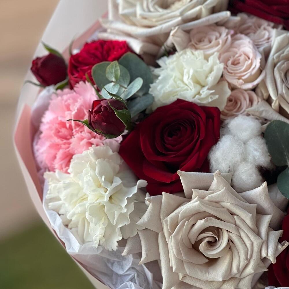 Роза красная – 3 шт.Роза кустовая – 1 шт.Эвкалипт – 1 шт.Роза пионовидная – 1 шт.Гвоздика сортовая – 5 шт.Упаковка дизайнерская – 1 шт.Кризал (подкормка) – 1 шт.Хлопок натуральный – 3 шт.Роза серая – 3 шт.Лагурус (сухоцвет) – 3 шт.