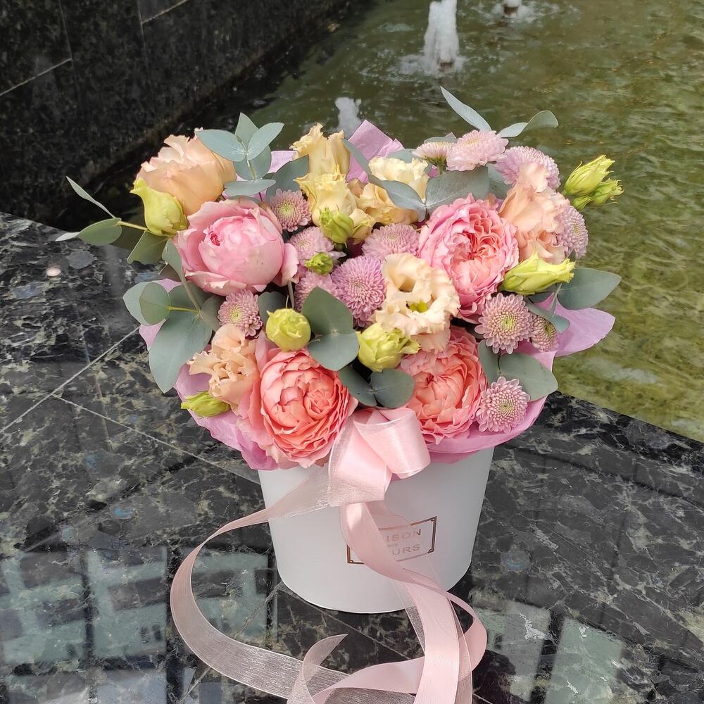 Лента – 2 шт.Лизиантус – 2 шт.Хризантема кустовая – 3 шт.Эвкалипт – 1 шт.Роза кустовая пионовидная – 1 шт.коробка кашпо – 1 шт.
