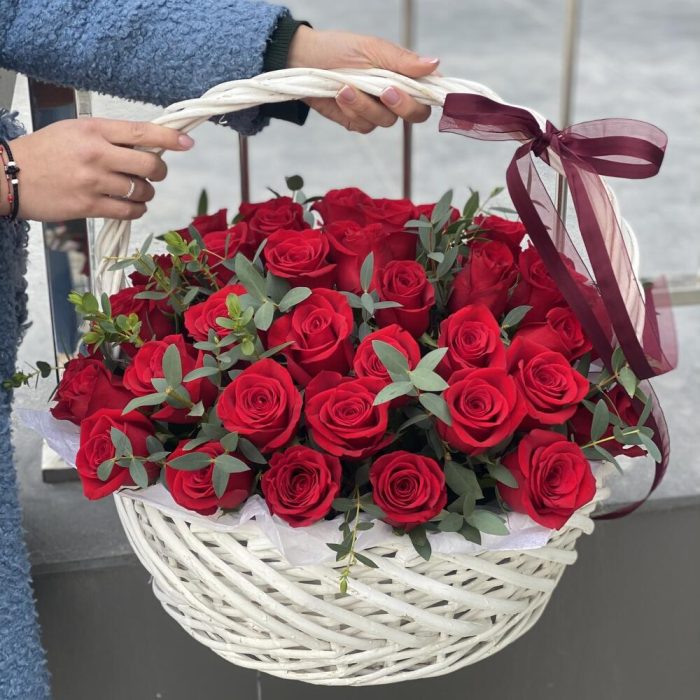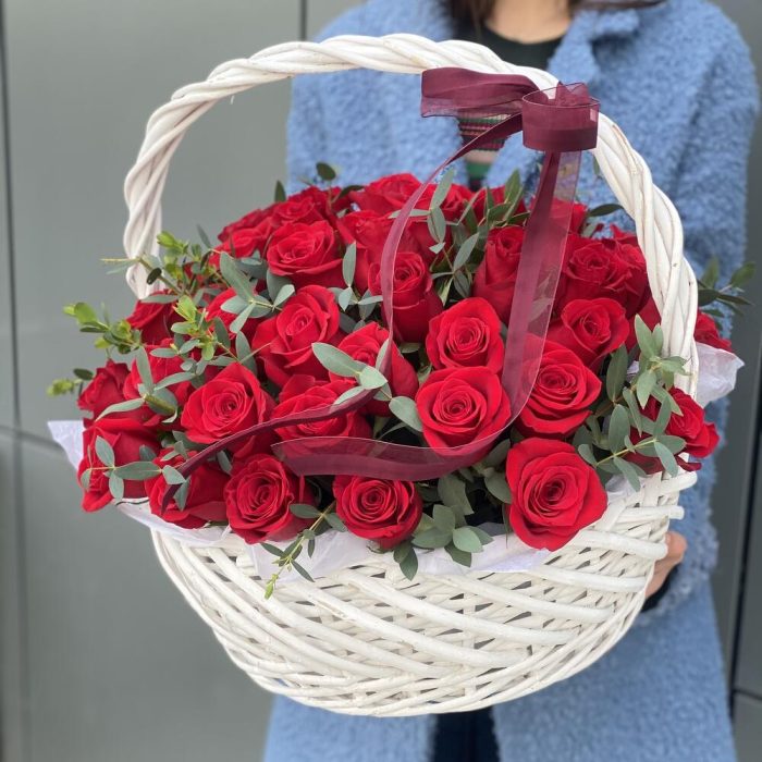 Метки: 14 февраля, 51 роза, от 5000 руб, Роза 30 см, Розы в корзине, цветы в корзине
