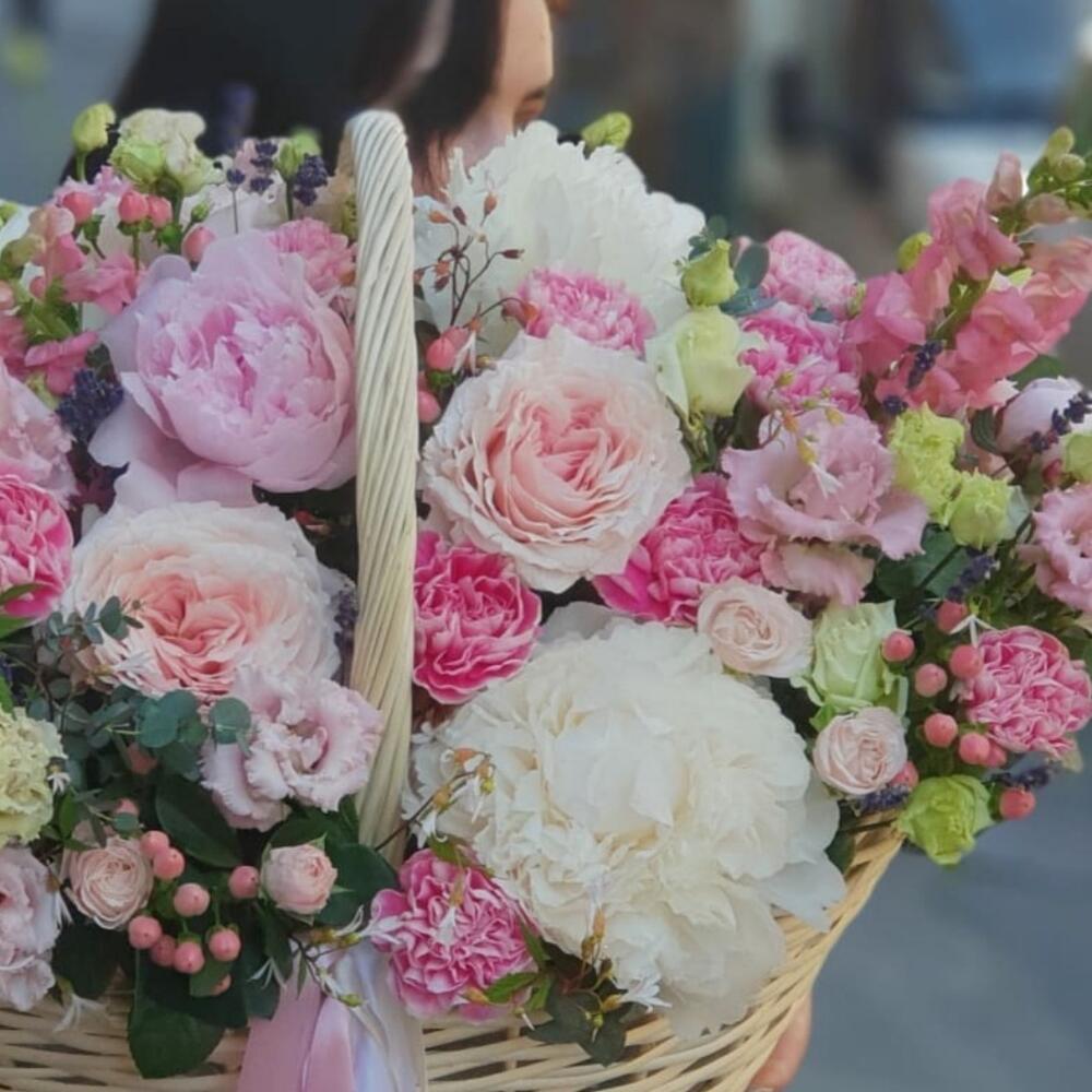 Корзина плетеная – 1 шт.Оазис флористический – 3 шт.Пион – 5 шт.Роза пионовидная – 4 шт.Хиперикум – 5 шт.антиринум – 5 шт.Диантус – 15 шт.Лизиантус – 4 шт.Эвкалипт Baby Blue – 7 шт.Лаванда – 40 шт.