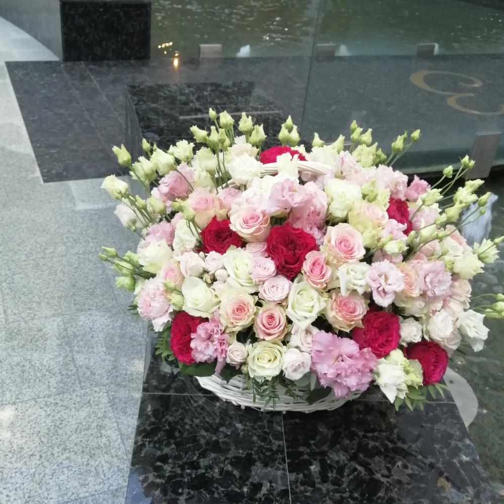 Роза – 25 шт.Роза кустовая – 17 шт.Роза пионовидная – 10 шт.Эустома – 10 шт.Гвоздика – 10 шт.Эвкалипт – 15 шт.Корзина – 1 шт.Оазис – 2 шт.