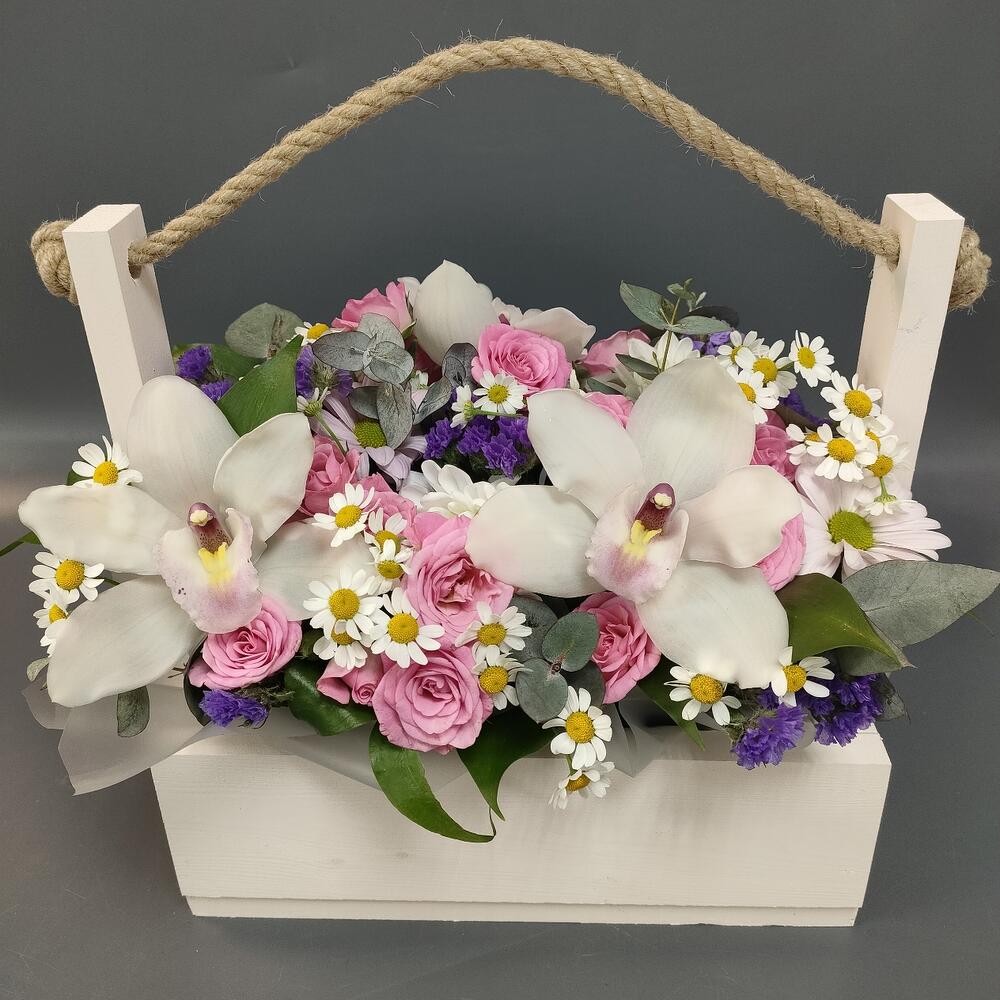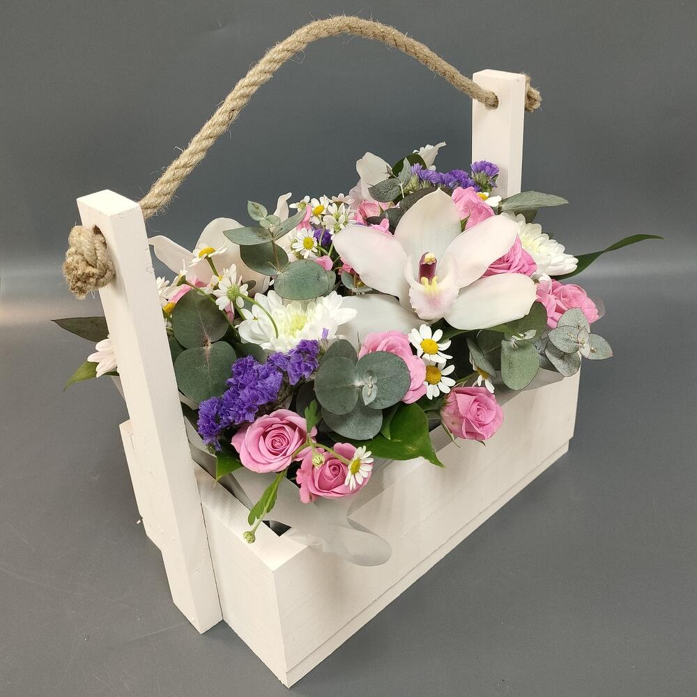 Ящик деревянный – 1 шт.Оазис флористический – 1 шт.Рускус сочи – 3 шт.Эвкалипт – 1 шт.Роза кустовая – 3 шт.Матрикария – 1 шт.Статица – 1 шт.Орхидея Цимбидиум – 3 шт.