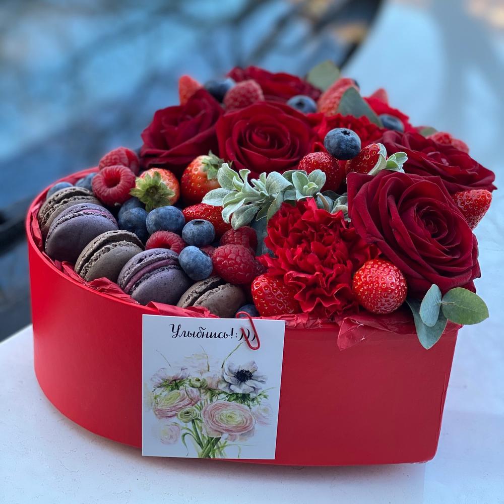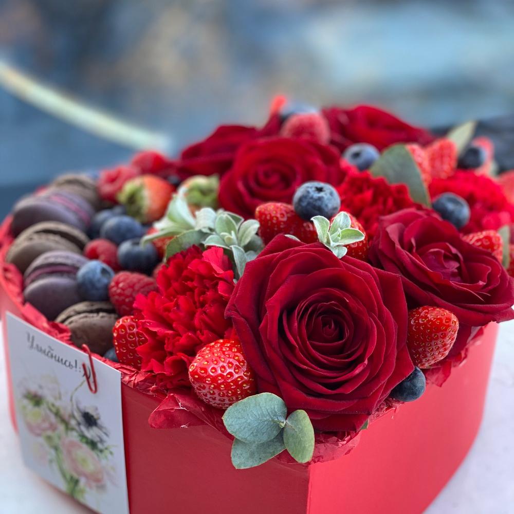 Сердце коробка – 1 шт.ягоды – 300 гр.Роза – 5 шт.Гвоздика – 3 шт.Зелень – 3 шт.