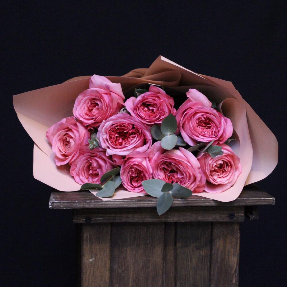 роза пионовидная pink xpression – 9 шт.Эвкалипт – 2 шт.Пленка дизайнерская – 2 шт.Лента атласная – 1 шт.