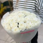 Роза одноголовая – 25 шт.Тишью белое – 2 шт.Матовая пленка – 2 шт.Лента атласная – 1 шт.Кризал (подкормка) – 1 шт.