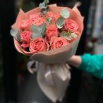 Нежный монобукет из роз с эвкалиптом в стильном оформлении