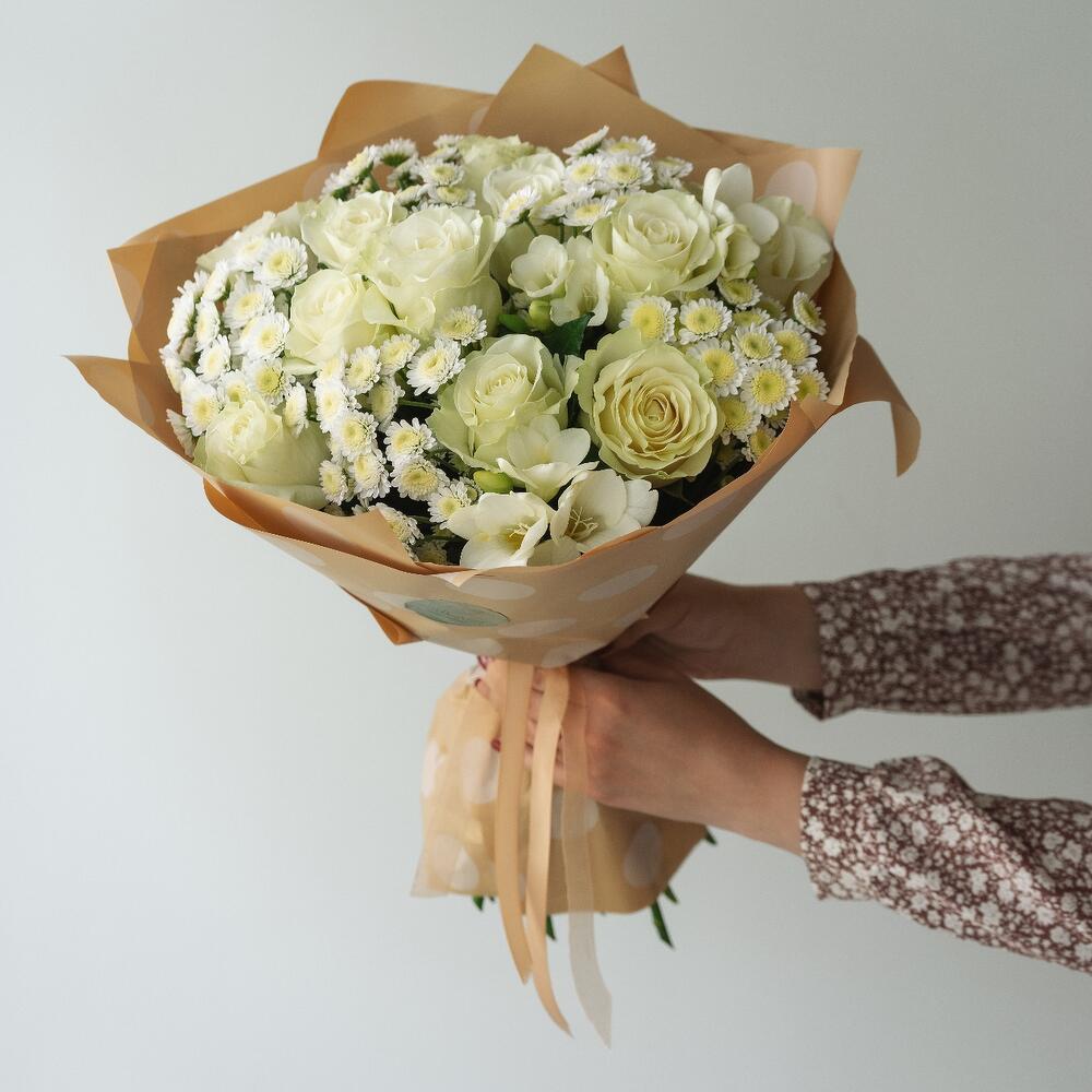 Фрезия – 3 шт.Роза одноголовая – 7 шт.Хризантема сталион – 4 шт.