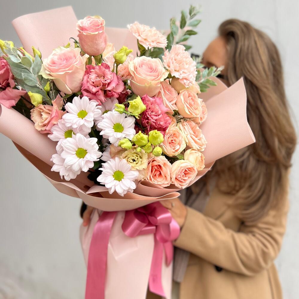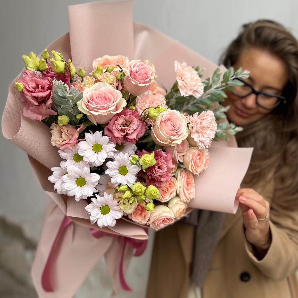 Альстромерии, Гвоздики, Кустовые розы, Лизиантусы, Розы, Хризантемы
