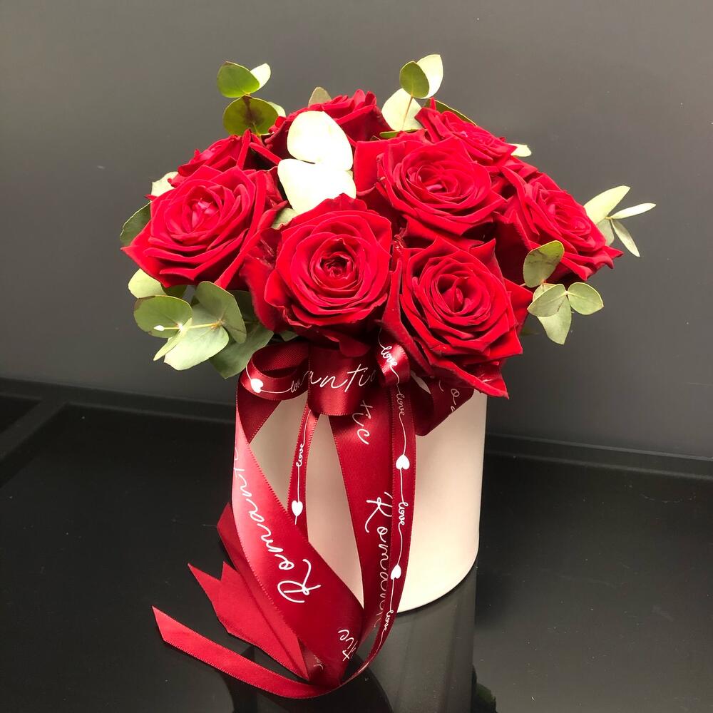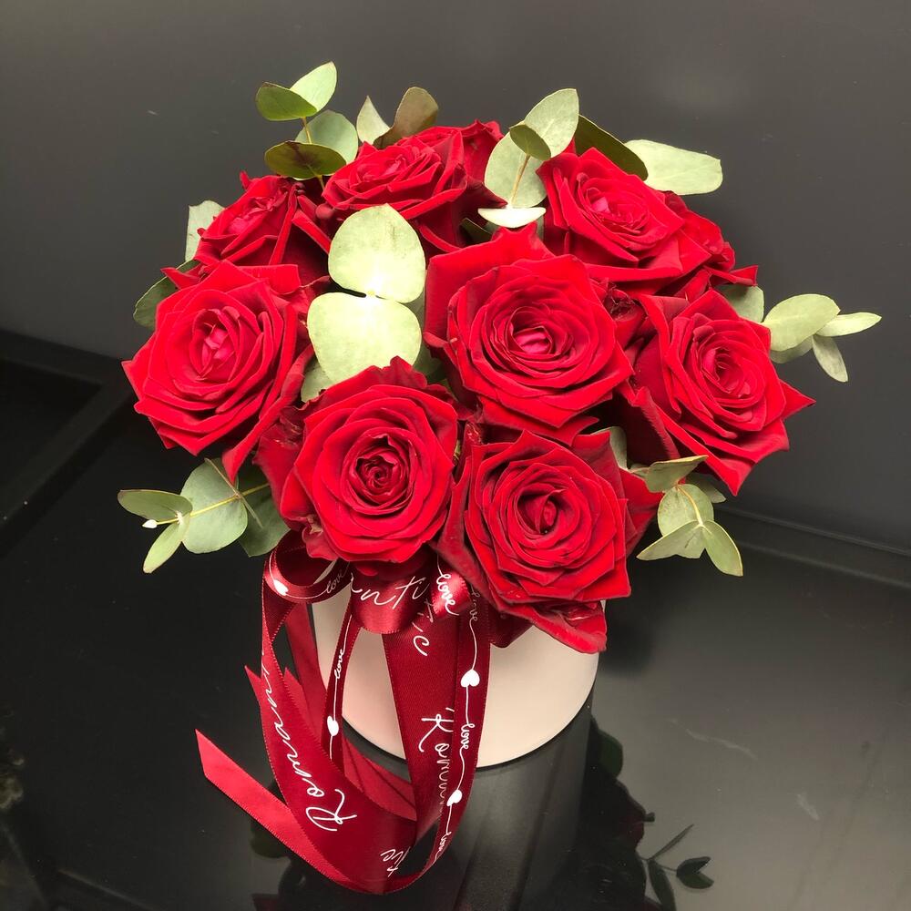 Стильная коробочка роз с эвкалиптом станет приятным подарком на любой повод!