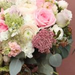 Садовый, авторский букет с ранункулюсами, пионовидными розами, амми, душистой маттиолой и эвкалиптом.