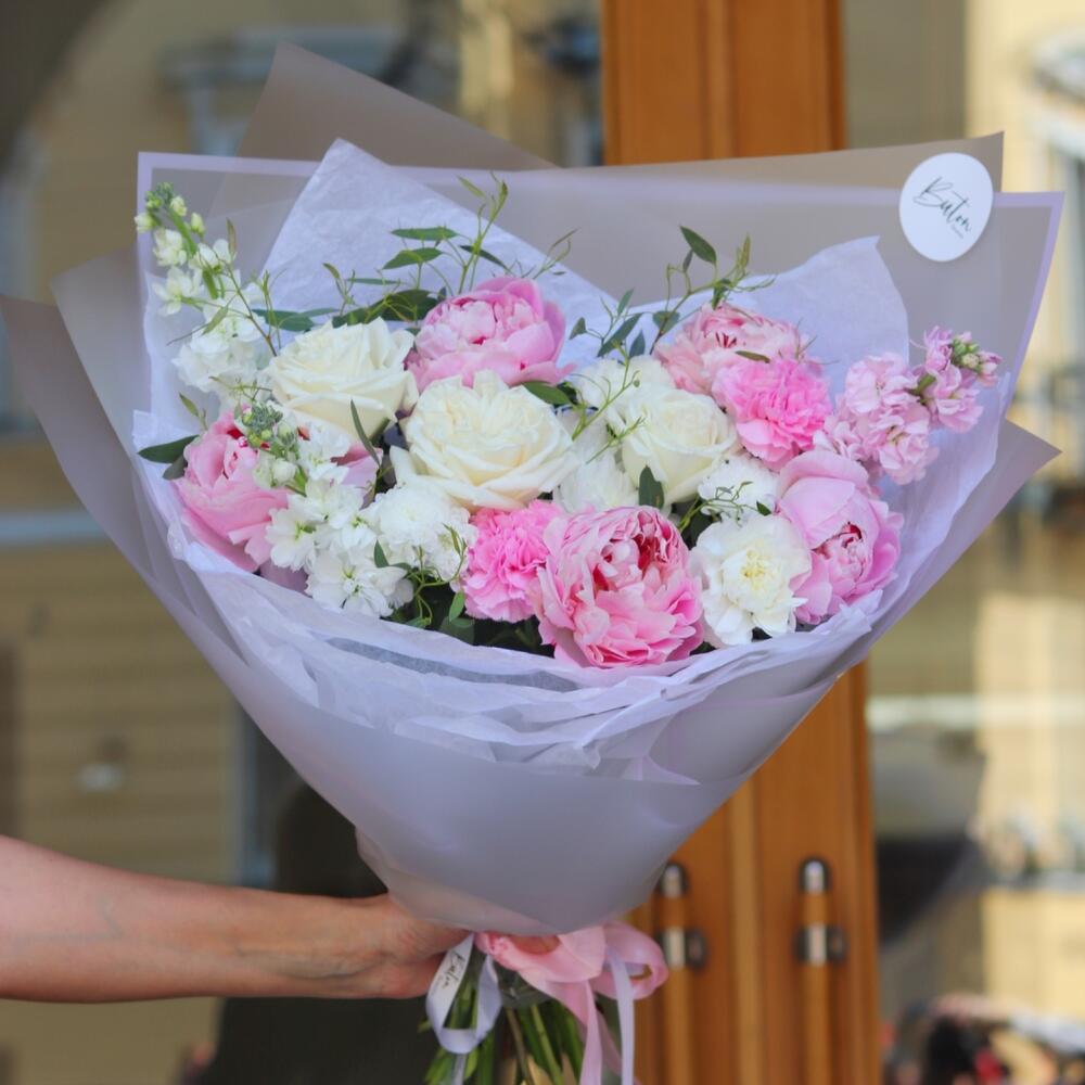Нежный, чувственный и воздушный букет, выполненный из пионов, роз, хризантемы и ароматной маттиолы.Такой букет точно понравится яркой и энергичной получательнице, и будет долго радовать её.К букету прилагается открытка с вашими пожеланиями, инструкцию по уходу за цветами и приятный комплимент от нашего магазина – шоколадка. Мы также будем рады отправить вместе с букетом конфеты, шоколад ручной работы или б/а вино по вашим пожеланиям, просто напишите нам в личные сообщения. Заказывая наш букет, Вы всегда получите исключительный сервис и заботу о клиенте
