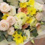 Солнце в руках, букет с ранункулюсами, ромашками и пионовидными розами