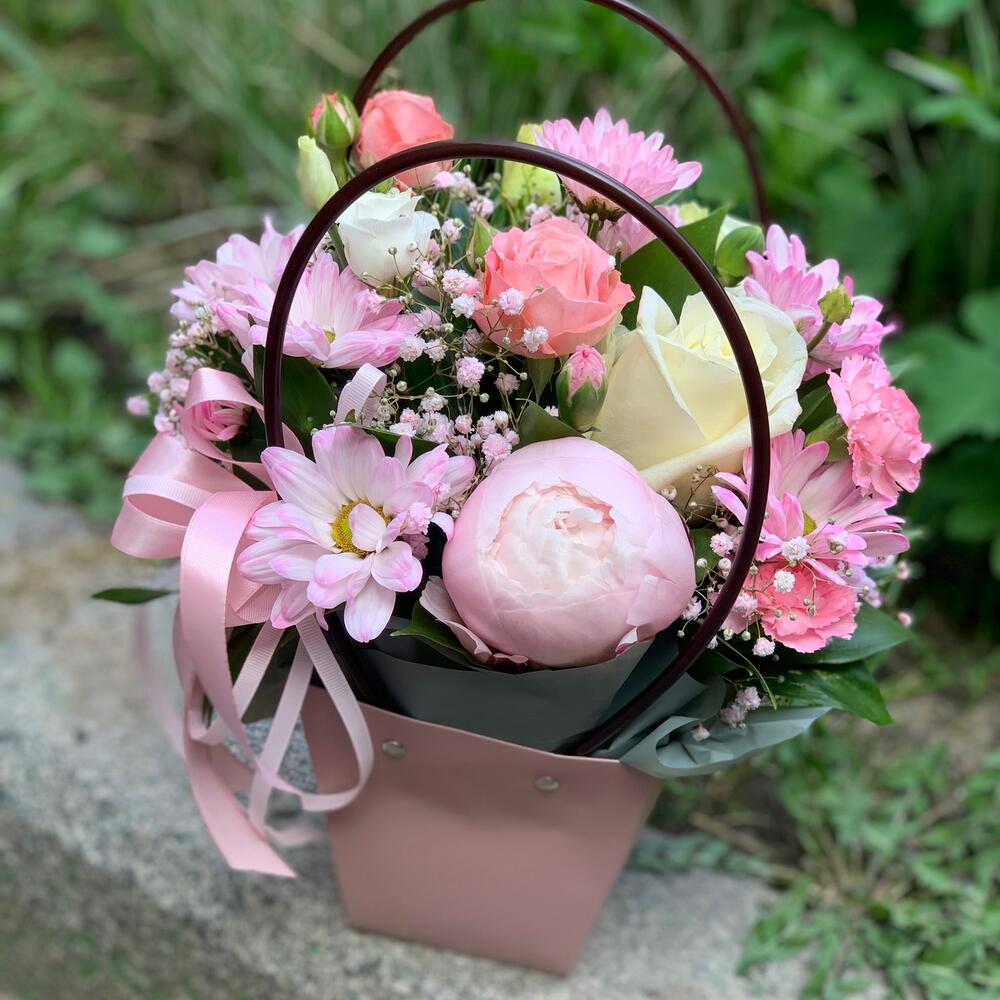Пион – 1 шт.Роза кустовая – 1 шт.Хризантема кустовая – 1 шт.Роза – 1 шт.Гвоздика – 1 шт.Сумочка – 1 шт.зелень декоративная – 6 шт.