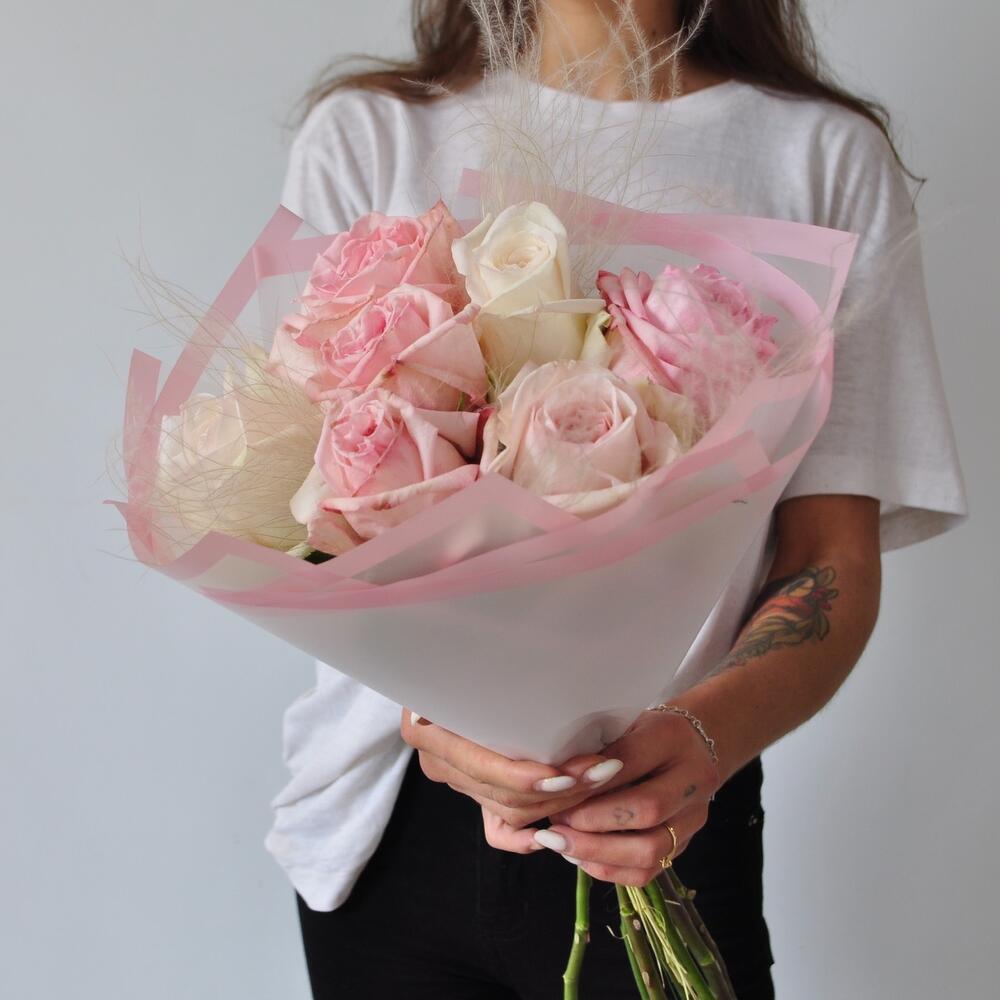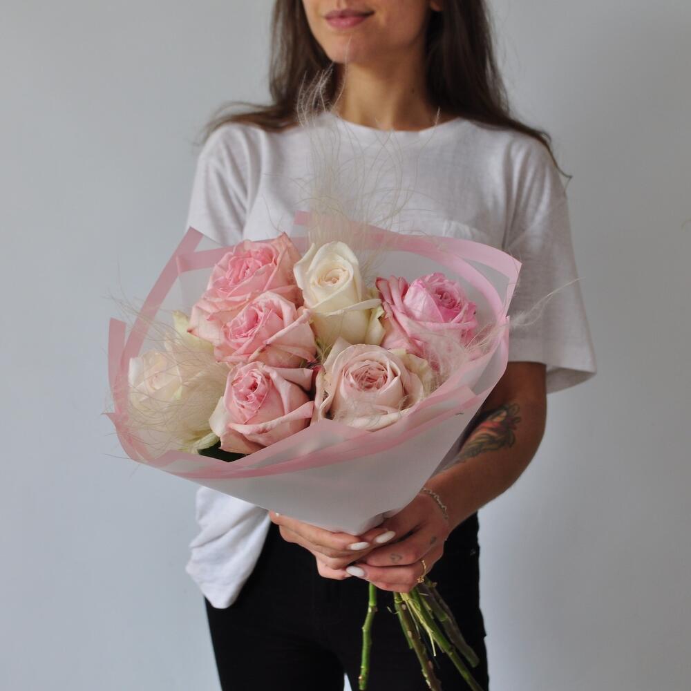 Лента атласная – 1 шт.Упаковка дизайнерская – 1 шт.Ковыль – 3 шт.роза охара пионовидная – 7 шт.