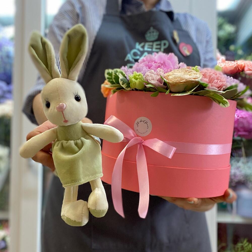 Хризантема кустовая – 2 шт.Коробка шляпная – 1 шт.Роза кустовая пионовидная – 2 шт.Пирожные макарон – 3 шт.Диантус сортовой – 3 шт.Пион импортный – 1 шт.Эустома алиса – 2 шт.Губка флористическая – 1 шт.зелень декоративная – 1 шт.зайка плюшевый 20 см – 1 шт.
