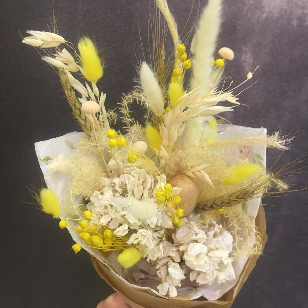 гортензия сухоцвет – 2 шт.рож – 2 шт.Лагурус – 8 шт.Ковыль – 2 шт.дополнительные цветы – 7 шт.Грецкий орех – 1 шт.