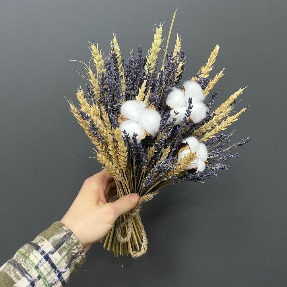 Хлопок натуральный – 3 шт.бечевка натуральная – 1 шт.лаванда сухоцвет банч – 1 шт.пшеница (сухоцвет) банч – 1 шт.