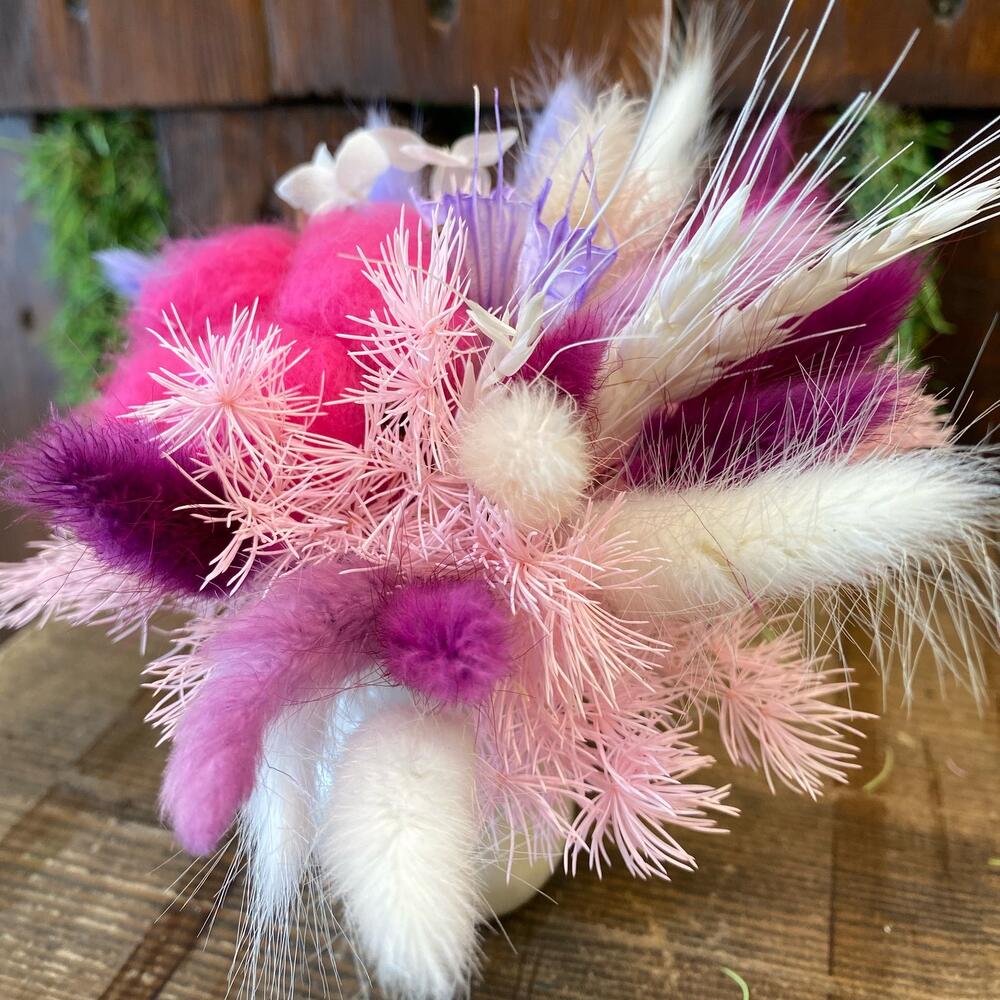 Сухоцветы – 10 шт.Лагурус (сухоцвет) – 20 шт.Хлопок – 3 шт.Лаванда (сухоцвет) – 15 шт.Кашпо керамическое – 1 шт.