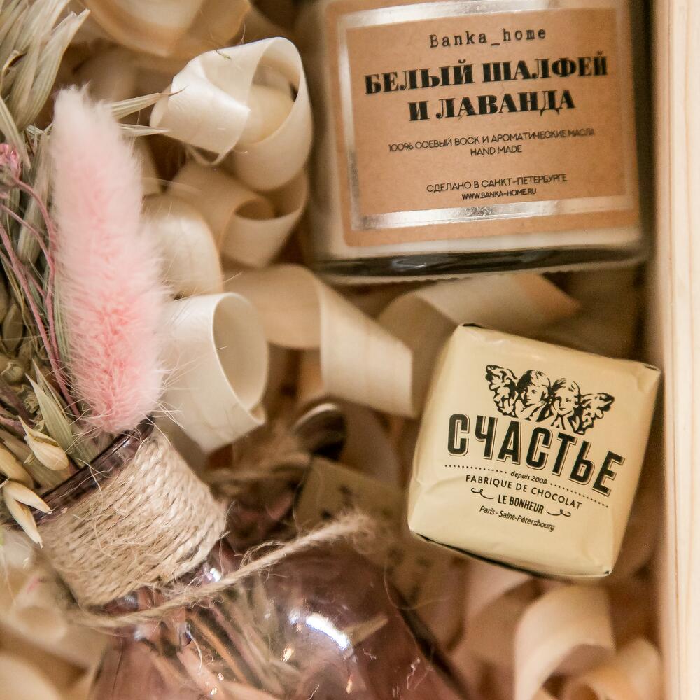 Ящик деревянный – 1 шт.Ваза стекло – 1 шт.букет сухоцветов – 1 шт.свеча банка home – 1 шт.бомбочка из натуральных масел для ванной – 1 шт.конфеты счастье – 2 шт.