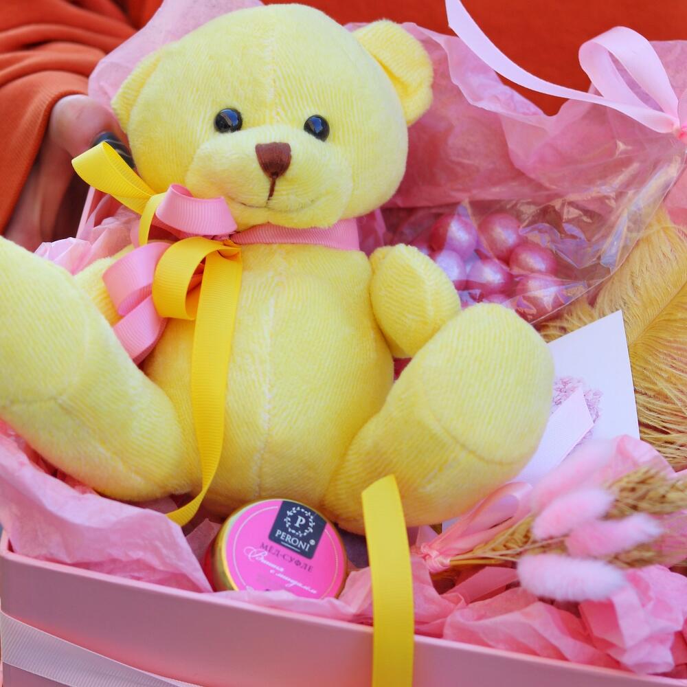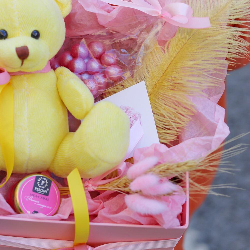 Мишка плюшевый – 1 шт.Мед-суфле – 1 шт.Открыточка с вашими пожеланиями – 1 шт.Драже – 1 шт.букет из сухоцветов – 1 шт.