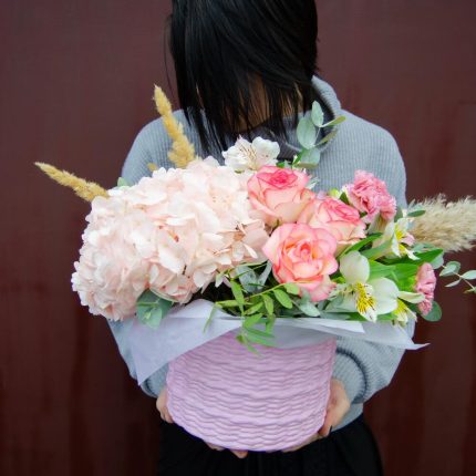 Большой авторский букет из французских и пионовидных роз с маттиолой с эвкалиптом